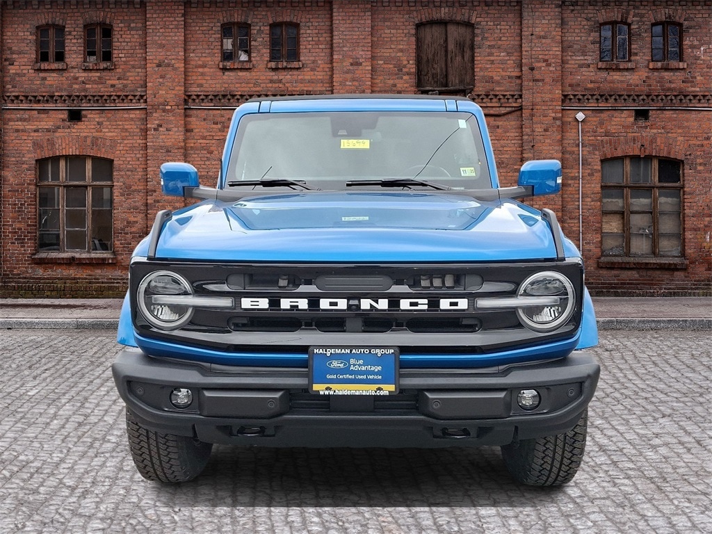 REMAINDER OF FACTORY WARRANTY, INCLUDES WARRANTY, RECENT HALDEMAN TRADE IN, 172 POINT SAFETY INSPECTION, RECENT SAFETY INSPECTION, 4X4, TURBO CHARGED, Ready for adventure? This stunning 2022 Ford Bronco Outer Banks is the perfect vehicle to take you off the beaten path. Finished in an eye-catching Velocity Blue Metallic exterior, this 4-door SUV combines rugged capability with modern style. The LTH-TRM/Vinyl Gray/Navy STS interior offers a comfortable and durable cabin for all your excursions. With only 25,581 miles on the odometer, this Bronco is barely broken in and ready for its next owner. It's powered by a strong 2.3L EcoBoost I-4 engine paired with a 10-speed automatic transmission, ensuring a smooth ride whether you're on the highway or exploring a trail. This Outer Banks model comes loaded with features, including a High Package with a 12" LCD touchscreen, heated seats, and a wireless charging pad. It also has the optional 18" Machined Black-Pntd Alum Whls and a Front and Rear Locking Diff, making it exceptionally capable. Don't miss out on this chance to own a low-mileage, feature-packed Bronco that's built for both daily driving and serious off-roading. Itâs the perfect vehicle for anyone who wants to explore without limits., 12" LCD Capacitive Touchscreen w/Swipe Capability, 2 Smart Charging USB Ports In Dashboard, 360-Degree Camera, Adaptive Cruise Control, Additional Sound Deadening, Connected Built-In Navigation, Equipment Group 314A Lux Package, Evasive Steering Assist, Front Parking Sensors, Heated Steering Wheel, Information on Demand Panel, Navigation system: Connected Navigation, Radio: B&O Sound System by Bang & Olufsen, Sideview Mirrors, Universal Garage Door Opener, Wireless Charging Pad. Clean CARFAX. Priced below KBB Fair Purchase Price! Certified.